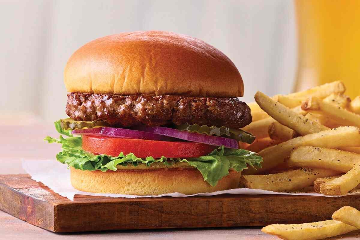 All burgers come with seasoned fries, and plant-based diners can choose the Impossible Cheeseburger.